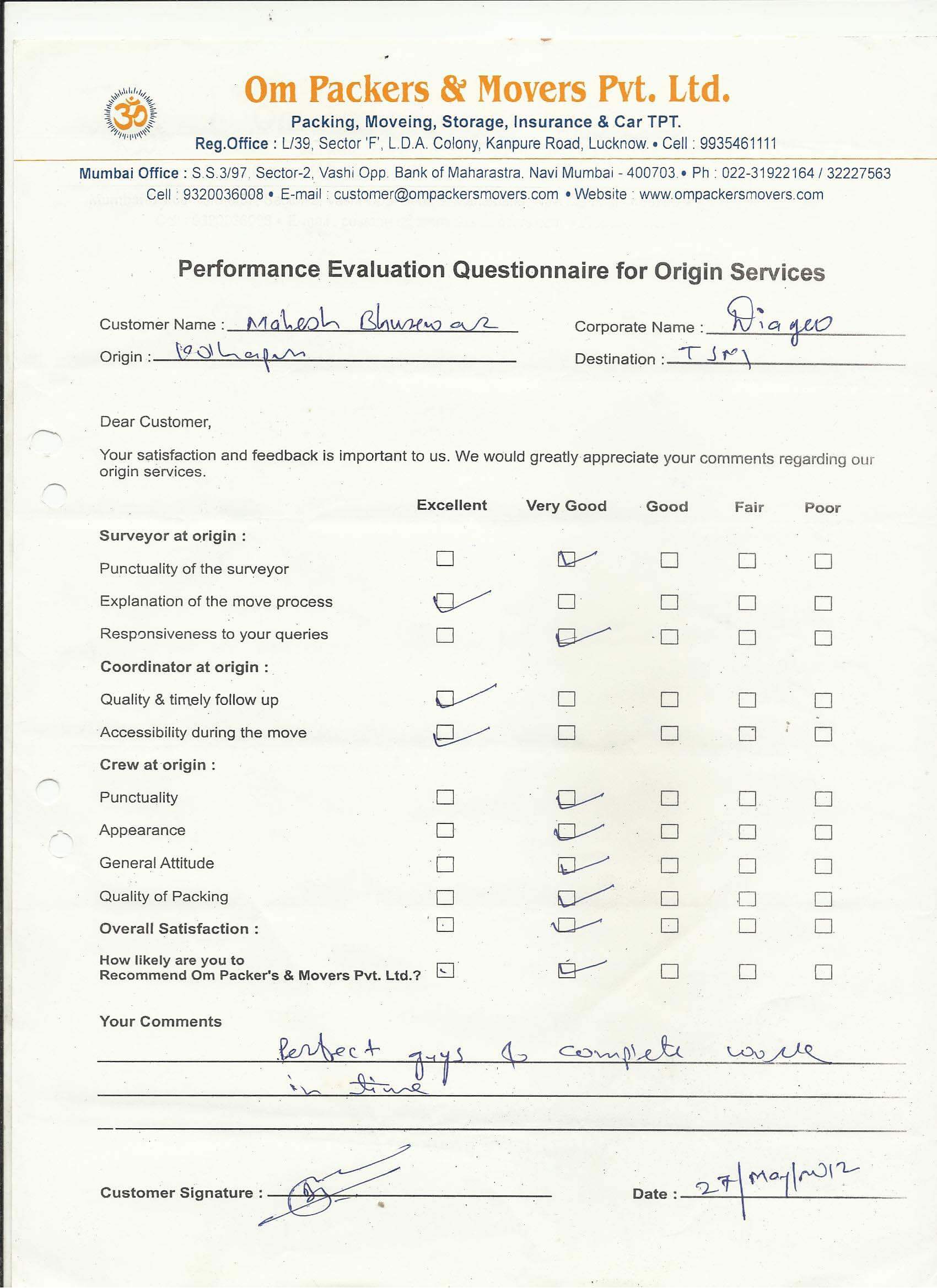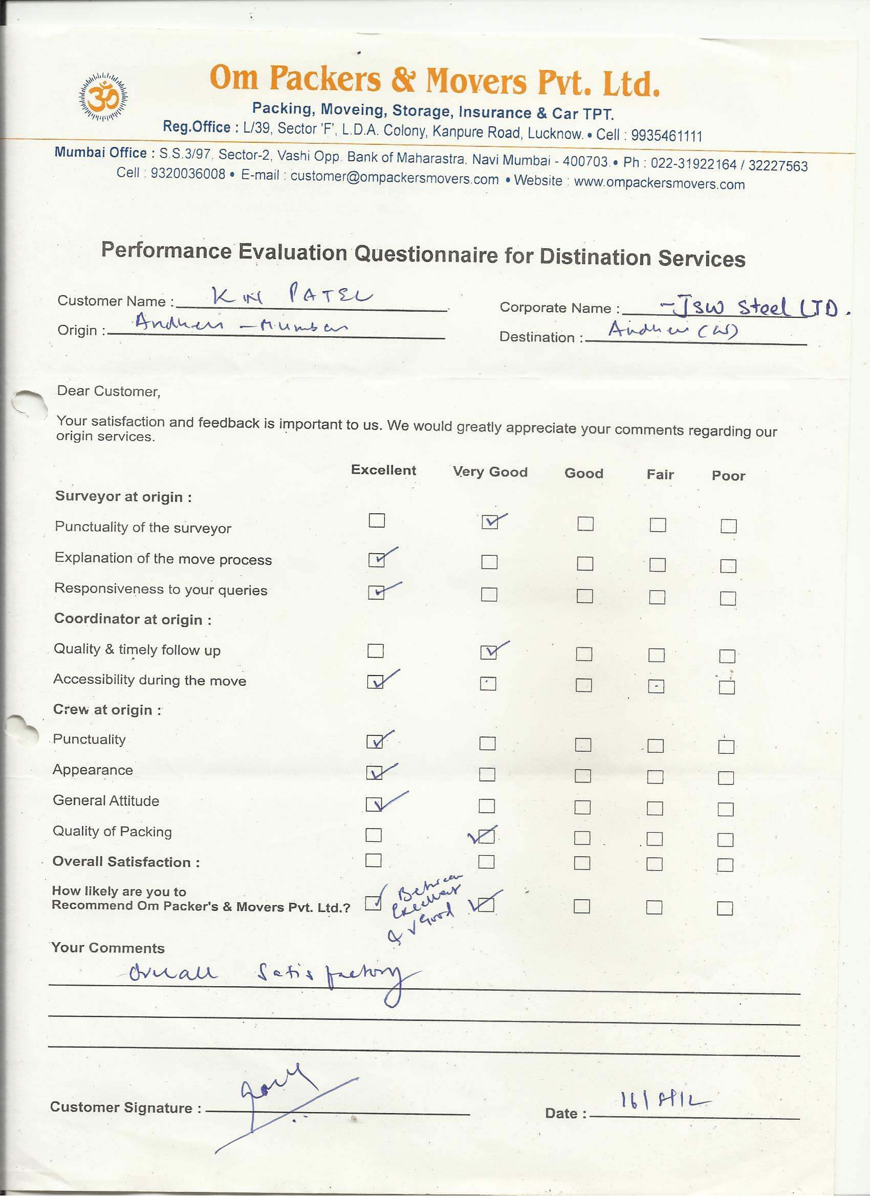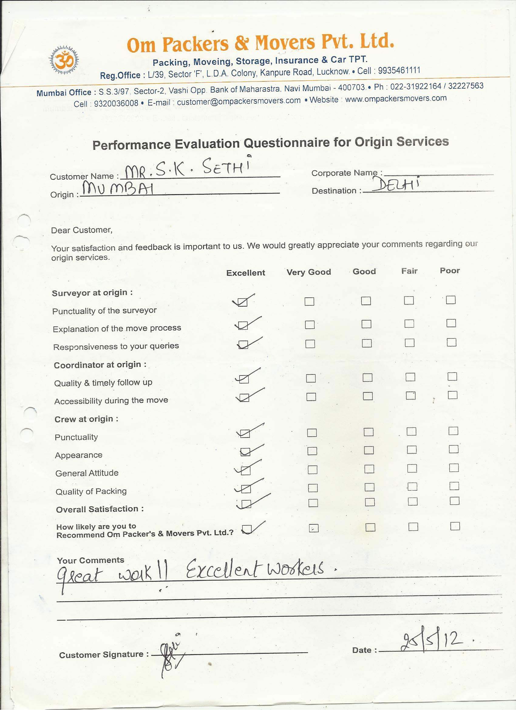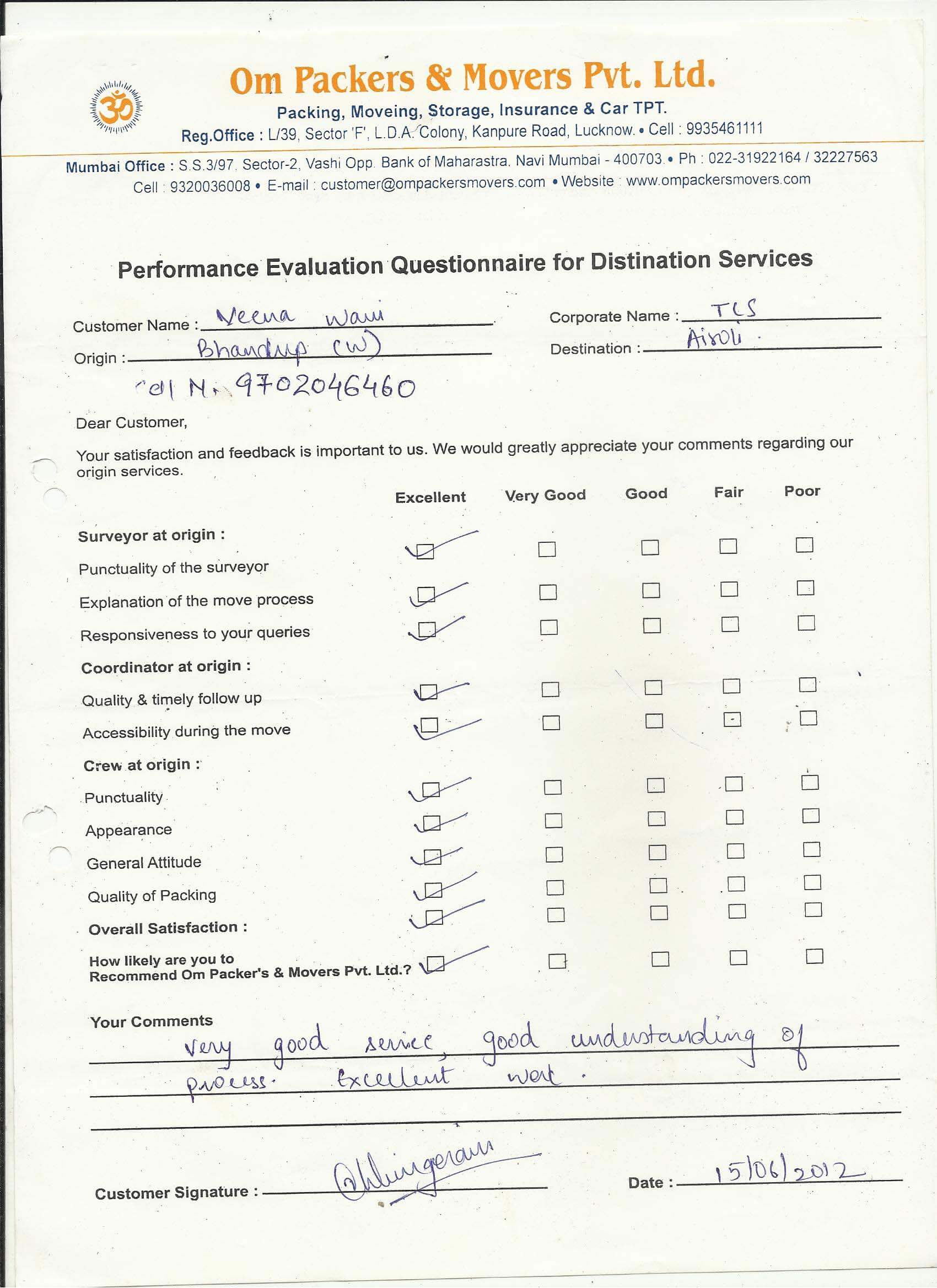 Om Packers & Movers Pvt. Ltd. was smooth and quick.The quote they gave me was accurate and they were good honest on time. Nothing broke in transit what else could I ask for.